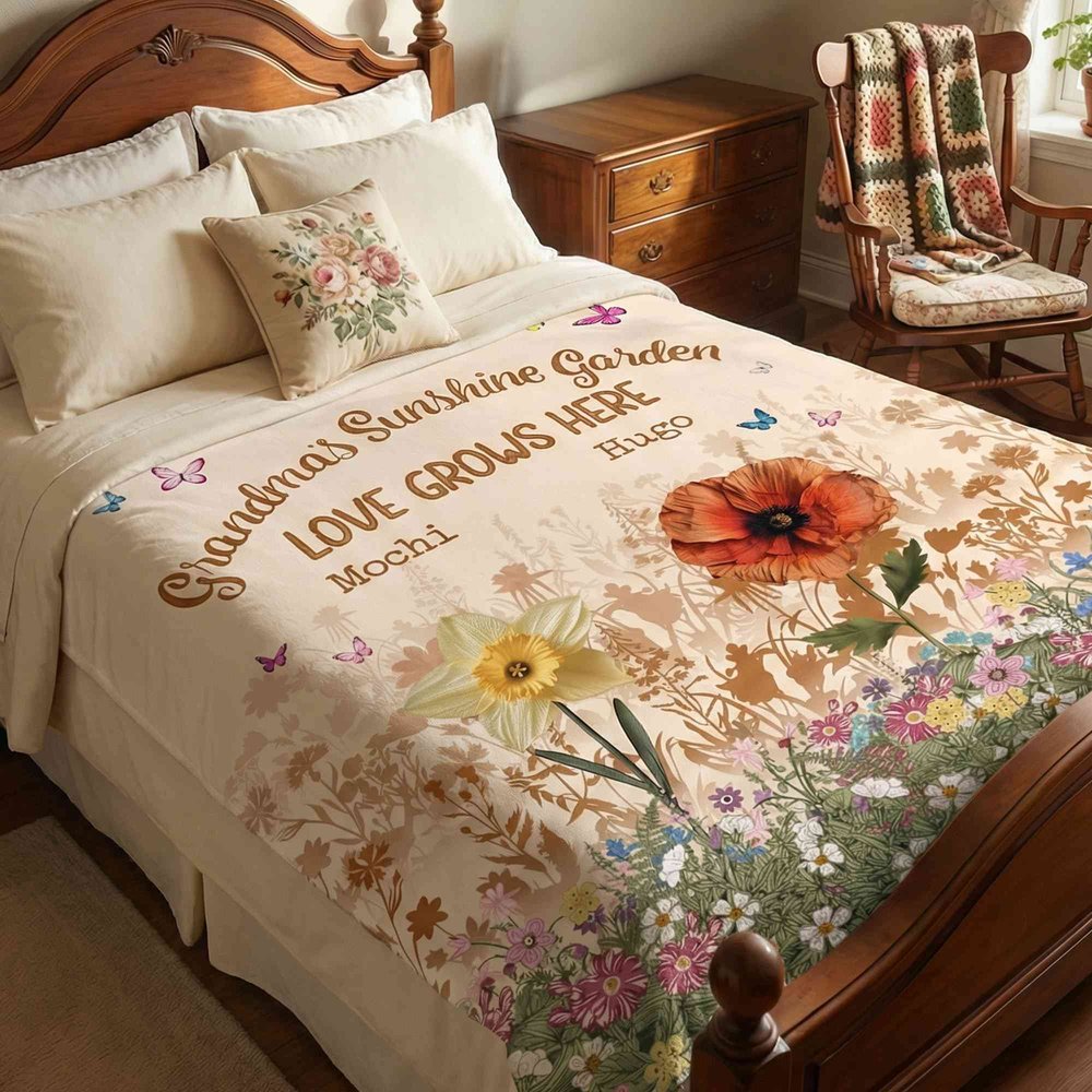 The blanket features a whimsical, garden-inspired design with a lush arrangement of birth flowers, including roses, daffodils, pansies, and asters, against a soft-colored background. Delicate butterflies flutter among the blooms, adding a playful and romantic touch. You can customize a title, select 1 to 12 birth flowers, and pair each with a personalized name.