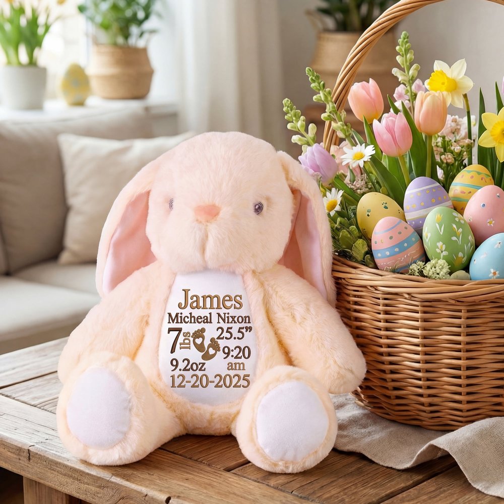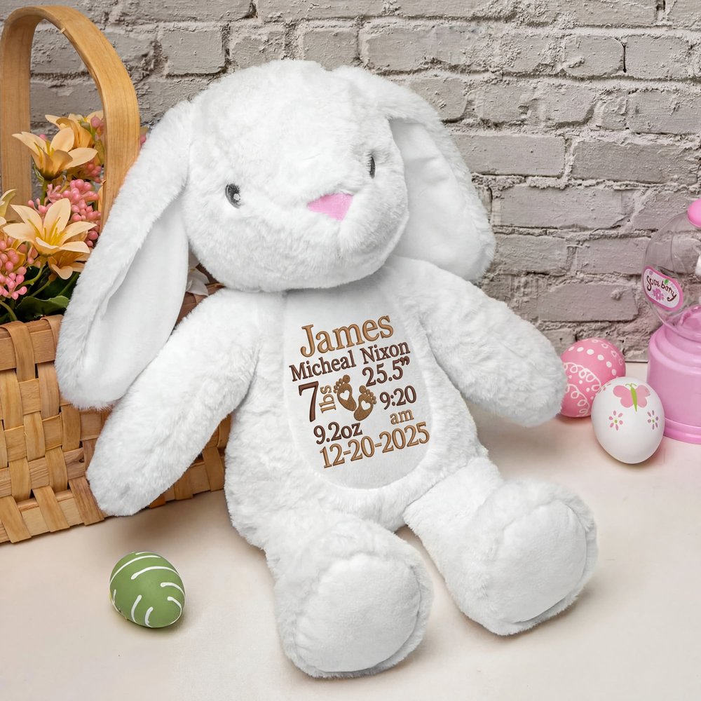 Perfect as a baby shower gift, newborn present, christening keepsake, or "welcome home" surprise for a new baby. Whether for your own little one, a grandchild, niece, nephew, or friend's bundle of joy, this personalized plush bunny captures the magic of those first precious days—and becomes a treasured friend for years to come.