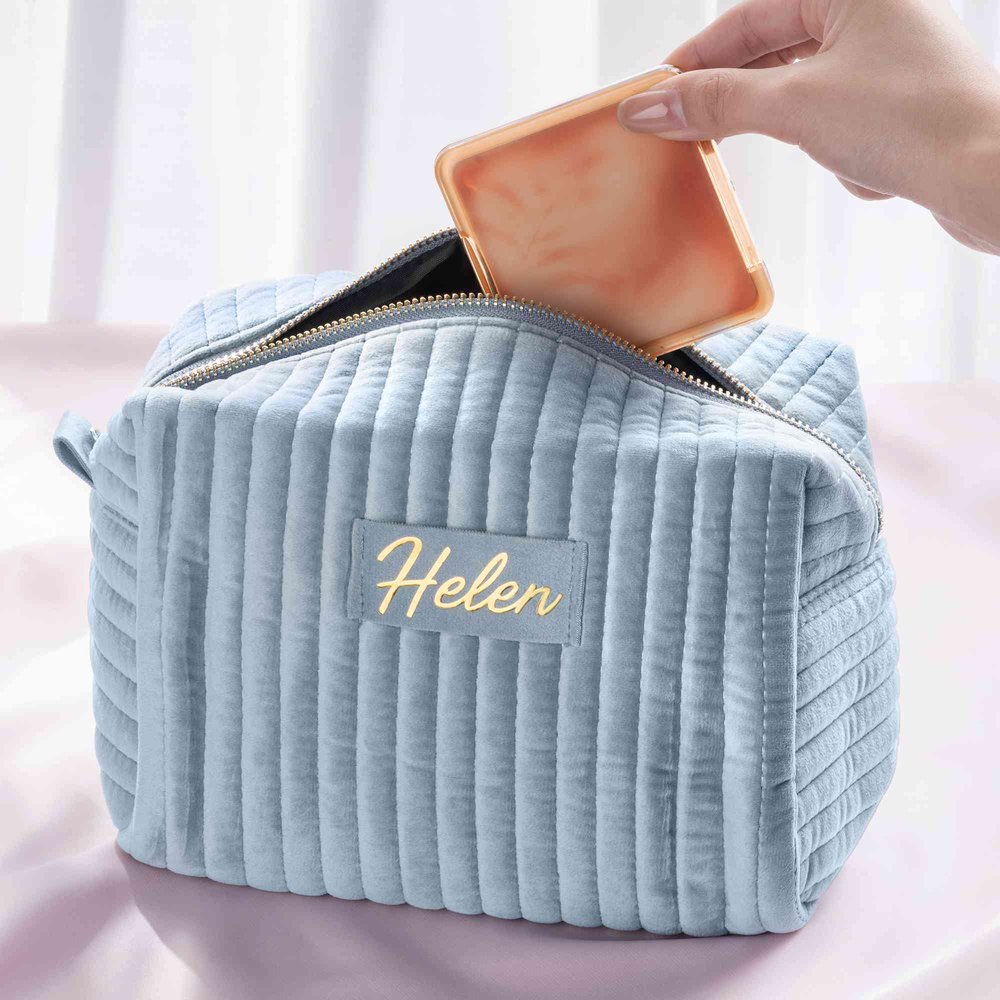 This Personalized Bridesmaid Gift Set features a luxe, quilted makeup bag and matching velvet jewelry box, both custom-embroidered with her name in elegant gold script, the soft muted color palette and delicate details creating a sophisticated, thoughtful gift that perfectly celebrates your bond with bridesmaids, friends, or loved ones.