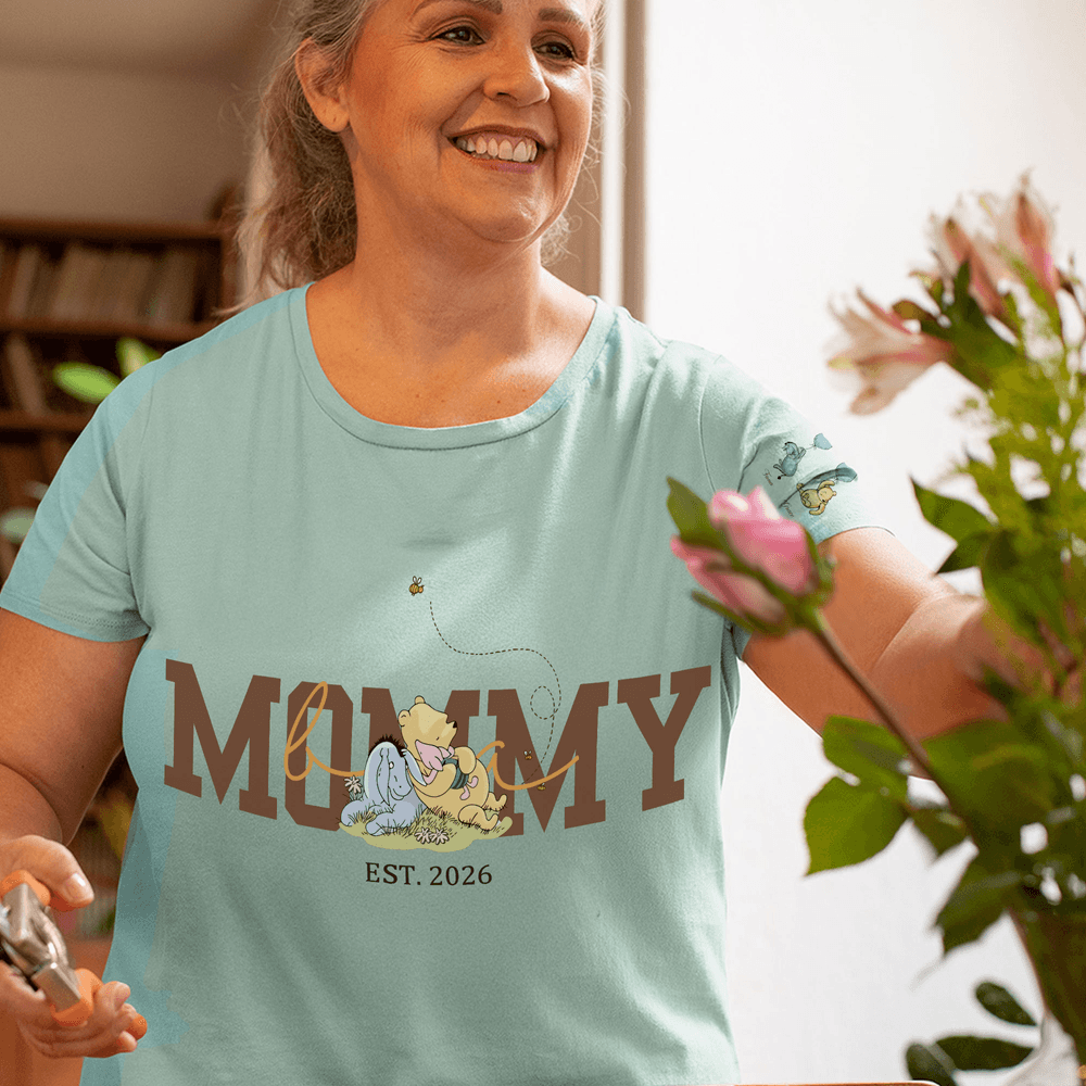 This clothing features a charming classic Winnie the Pooh character created by the renowned author A. A. Milne, who has captured the hearts of generations. Friends graphics with eye-catching lettering can be customized with your founding year and name. The sleeves can be fully personalized with your child's or grandchild's name, each accompanied by a balloon floating with a beloved character, adding a warm and unique touch. The soft retro cartoon style and neutral background create a comfortable and timeless design, brimming with warmth and maternal joy.