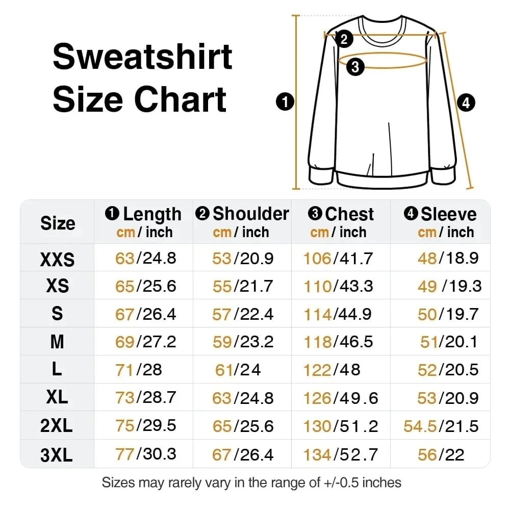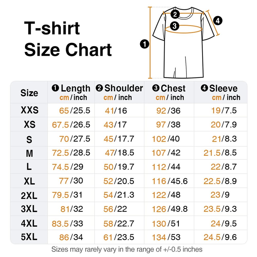 Measurement: T-shirt - XXS, XS, S, M, L, XL, 2XL, 3XL, 4XL, 5XL Sweatshirt - XXS, XS, S, M, L, XL, 2XL, 3XL