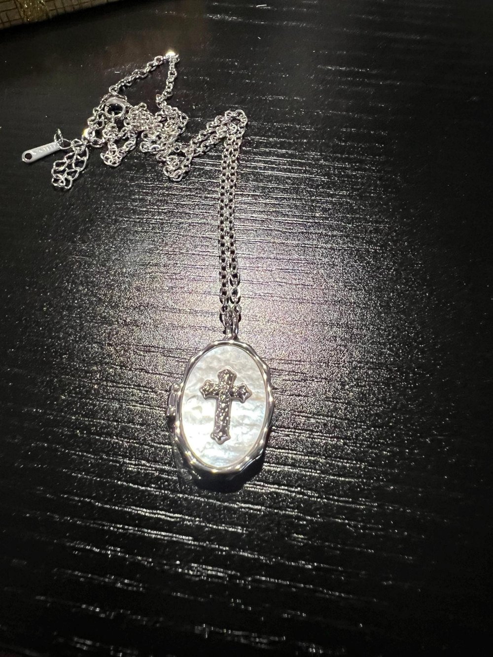 This stainless steel locket features a sparkling cross detail on its oval mother of pearl surface, blending timeless religious symbolism with a touch of shimmer. The cross adds a meaningful, faith-inspired touch, making it a beautiful expression of devotion.
